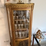 Originele en massieve halfronde sierlijke Antieke vitrinekast in Louis XV stijl, met hand geschilderde panelen in 18e eeuwse stijlen. Bronzen guirlande beslag (ormolu) met rozetten, eveneens op de gekromde pootjes. Binnenbekleding nog met het originele fluweel. De zijpanelen zijn hand geschilderd. Prachtig en sierlijk geheel, lang in prive bezit geweest. De kast is massief hout evenals de binnenbekleding en de gebogen originele ...