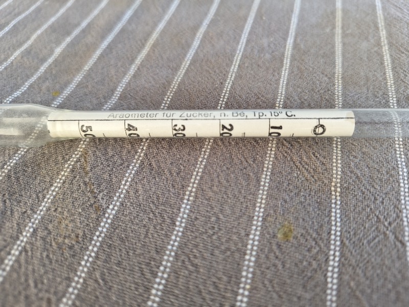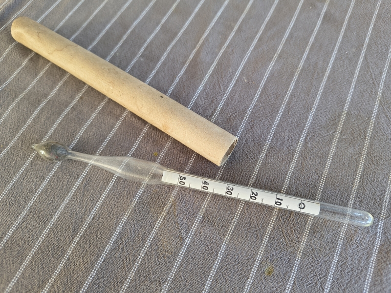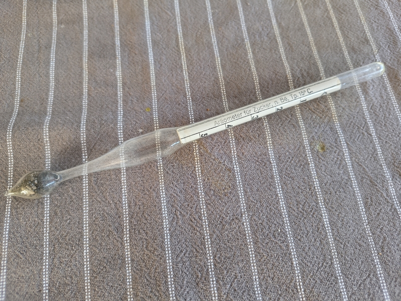 Aräometer (hydrometer)Dit is een zgn aräometer. Wordt gebruikt als suiker meter in de keuken. Om de juiste temperatuur van te smelten suiker te bepalen. De ontwikkelaar was Baumé. Op de meter staat zijn afkorting als Bé.De meter is van glas. Ca. 20 cm lang. De afleesschaal binnenin is van papier. Of deze ooit werkelijk gebruikt is, weet ik niet. Ik schat hem in als vooroorlogs.