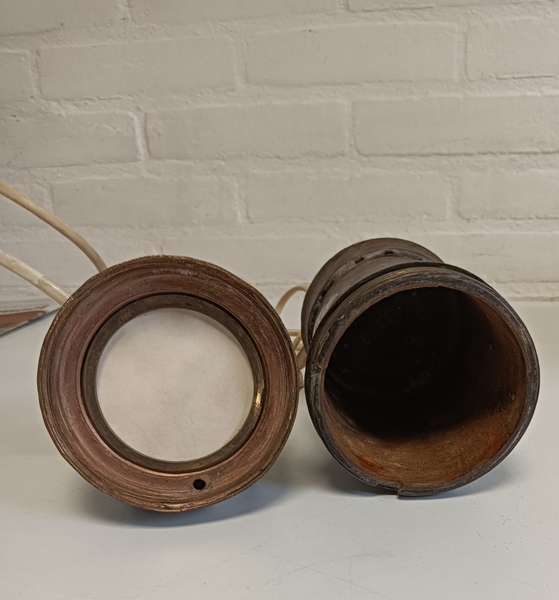 Nummer op de lamp zijn 911 en 595 Materiaal: Bovenste gedeelte is van roodkoper, onderste gedeelte lamp is van ijzer.